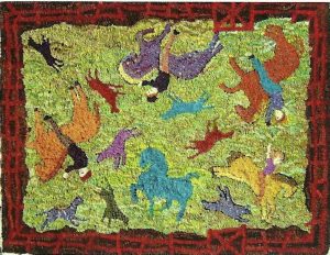 Horses and Hounds, 35″ x 52″ The artist has a love of bright colors. *Embellishments such as Arctic Rays, Fur, Roving, Burly Spun or Metallic Yarn for a 3D effect to add to your pattern! Perfect way to be creative!