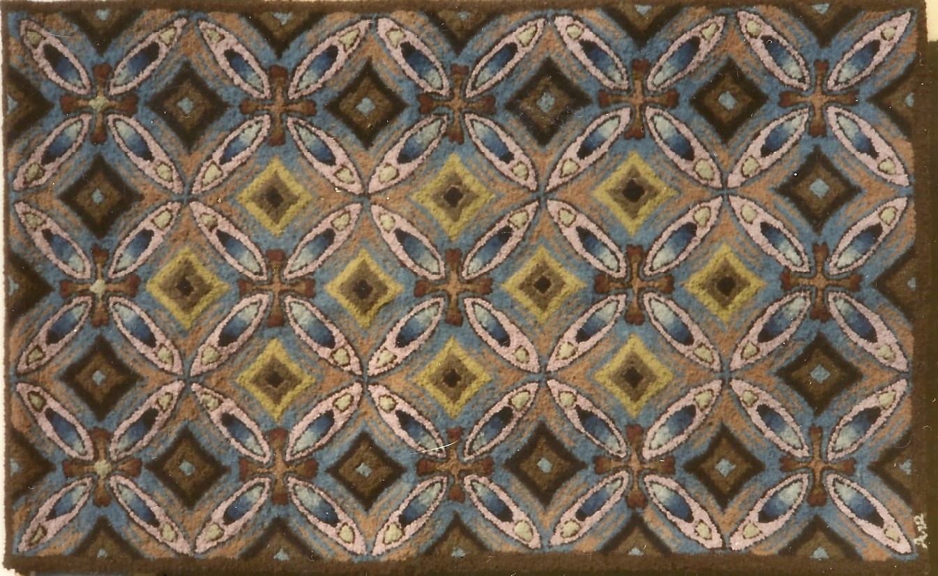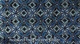 The gorgeous rug pictured with the rich blue tones was crafted by Delaine Miller. Please note–other examples from the archives of Joan Moshimer, there are no names available.