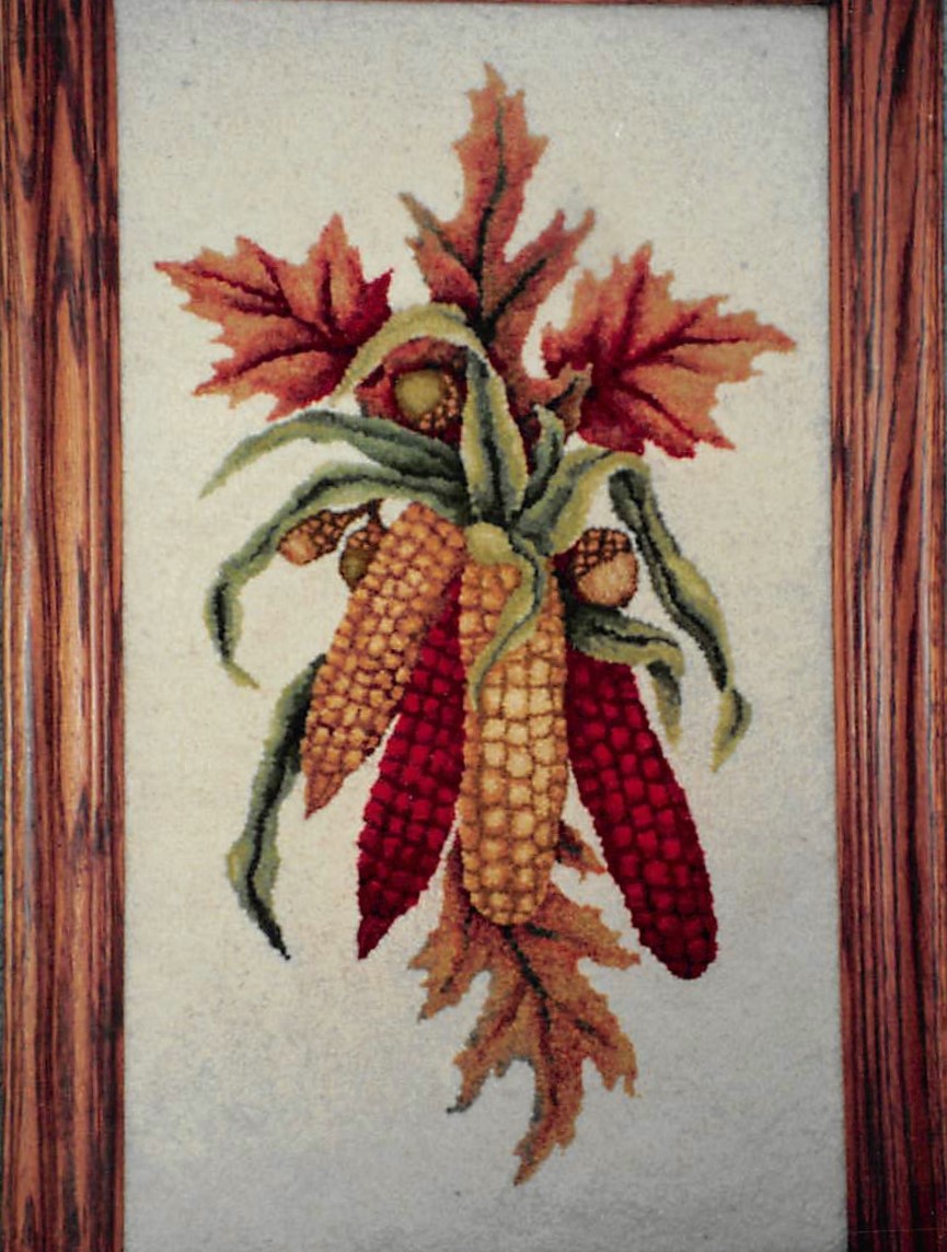 Indian Corn, Joan Moshimer Studio Pattern 12″ x 21″ A 57. Pattern originally designed by ANITA ALLEN. Great for a pillow or a hanging. Fun to use velvet, metallics, burly spun yarns and your stash! From our dyed wool collection, try Corn Husk, Mums The Word, Candy Corn, and Viola for your corn! Mix Textured wool with Dyed wool for a complete look. Please click the link to view all our in-stock textures. https://dev.wcushing.com/product-category/textured-wool/