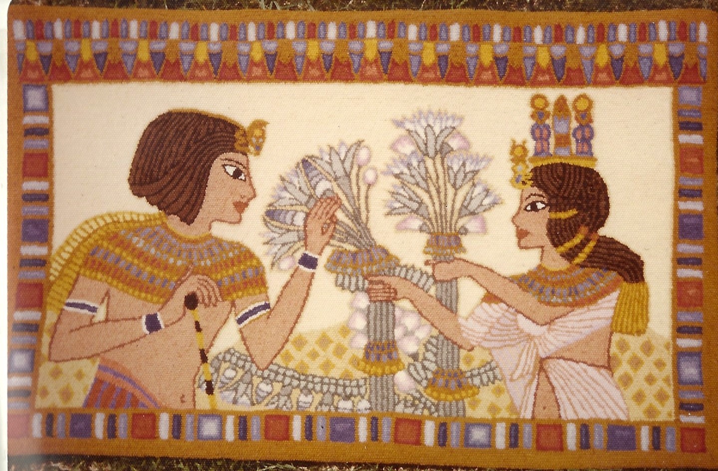 King Tut and his Wife M90 19 x 30, a Joan Moshimer Pattern. Beautiful Oriental Pattern. Embellishments are fun to add, such as Arctic Rays or Metallic Yarn for a 3D effect. Some dyed wools that would compliment are Imari Gold and Jade, Twinkle, Best of Blue, Paisley Red, or Sepia. Mix Textured wool with Dyed wool for a complete look. Please click the link to view all our in-stock textures. https://dev.wcushing.com/product-category/textured-wool/