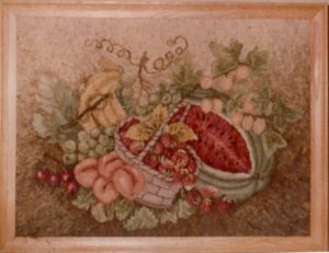 Kith OSV 706, a Pearl McGown pattern, 18″ x 24″.  It is a beautiful fruited pattern.  Embellishments are fun to add, such as Arctic Rays or Metallic Yarn for a 3D effect.  Try our dip spots hand dyed wool for shading effects.  We have a large variety of hand dyed wools for your rug such as Raspberry Burst, Jacob’s Peach, Bowl of Cranberries and more!  Mix Textured wool with Dyed wool for a complete look.  Please click the link to view all our in-stock textures.  https://dev.wcushing.com/product-category/textured-wool/