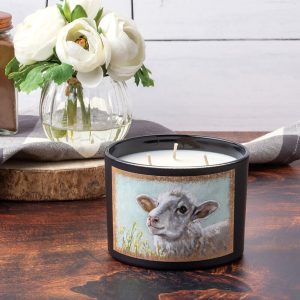 A jar candle displaying a double-sided design of a lamb in a meadow on black matte jar. Design is replicated from original artwork painted onto burlap canvas, giving the art a unique depth and texture.