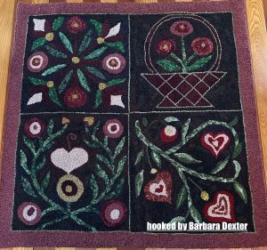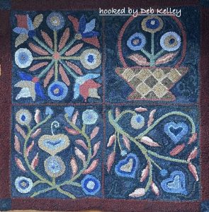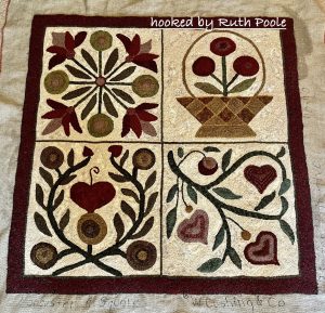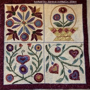 40″ x 40″ Lancaster Four Squared pattern by P is for Primitive. This pattern is on linen with edges serged. Embellishments are fun to add, such as Arctic Rays or Metallic Yarn for a 3D effect.