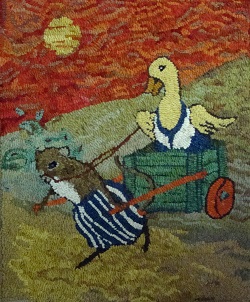 Ms. Duck Gets A Ride, 19″ x 23″ inspired by 1922 children’s book illustration. Off the Hook Wool Rugs Pattern designed by Sharon A. Smith, now part of the W. Cushing Treasury of Patterns. *Embellishments such as Arctic Rays, Fur, Roving, Burly Spun or Metallic Yarn for a 3D effect to add to your pattern! Perfect way to be creative!