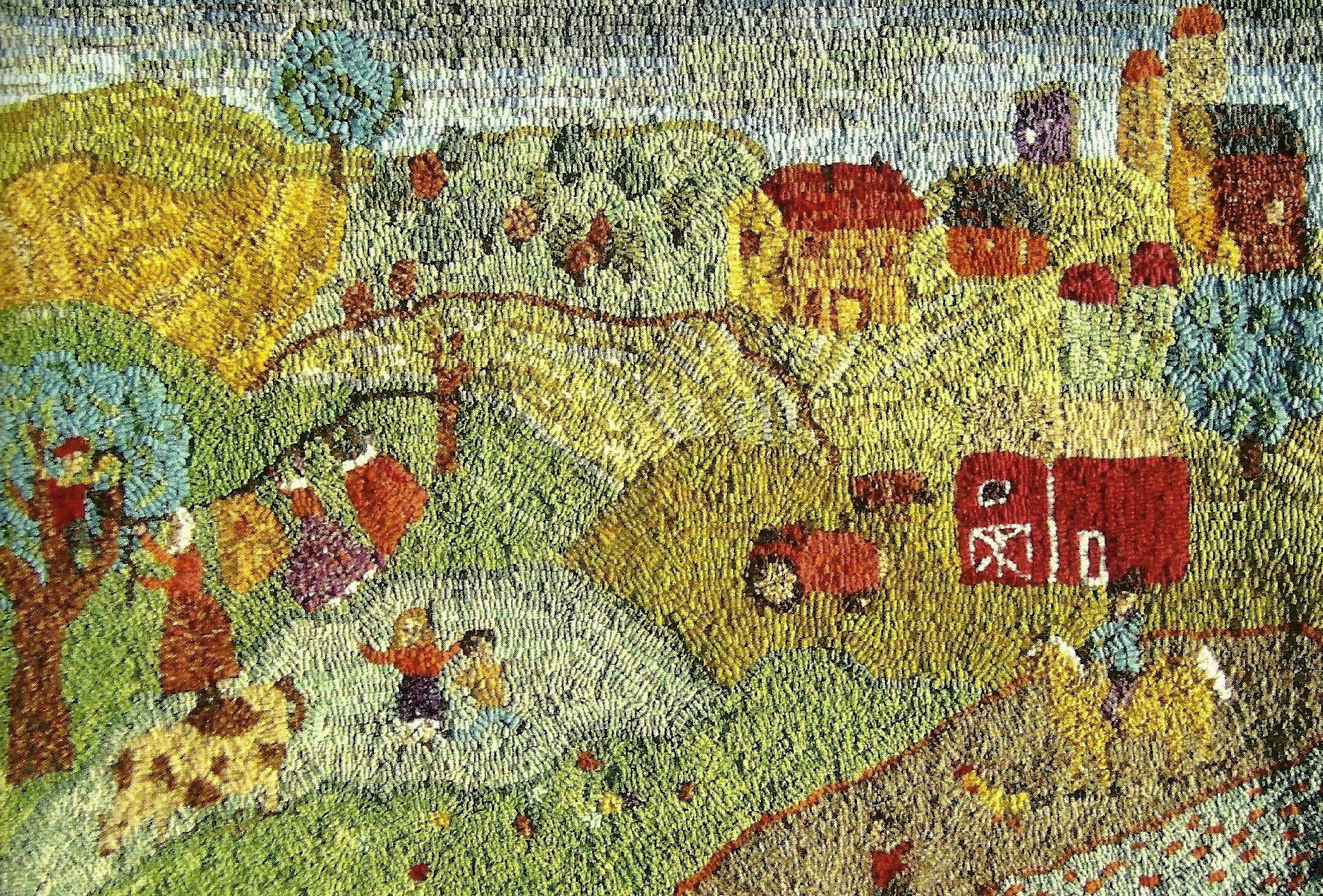 My Farm, 24″ x 35″. Off the Hook Wool Rugs Pattern designed by Sharon A. Smith, now part of the W. Cushing Treasury of Patterns. Embellishments are fun to add, such as Arctic Rays or Metallic Yarn for a 3D effect.