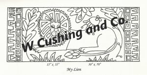 My Lion Large, pattern by Primitive Grace, 30″ x 70″. This pattern is available in another size–see separate listing. What a great pattern! Mixed fibers for this creation. Try fur, velvets or boucle yarn as mixed media in your rug. Try dyed wools such as Shades of Sepia, Bowl of Cranberries, Grassy Greens, Jacob’s Brown and more! Mix Textured wool with Dyed wool for a complete look.  Please click the link to view all our in-stock textures.  https://dev.wcushing.com/product-category/textured-wool/