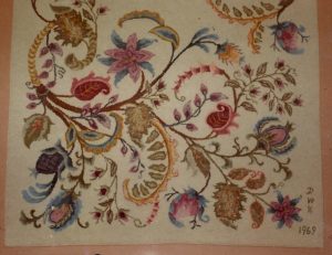 This beautiful crewel runner is My Reverie, by Pearl McGown OSV 807 38″ x 66″. It is a beautiful floral that embellishments are fun to add, such as Arctic Rays or Metallic Yarn for a 3D effect. Try our dip spots hand dyed wool for shading effects. We have a large variety of hand dyed wools for your rug such as Copley Square, Better Than Roses, Jacob’s Wine, Glacier and more! Mix Textured wool with Dyed wool for a complete look. Please click the link to view all our in-stock textures. https://dev.wcushing.com/product-category/textured-wool/