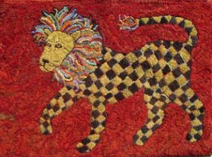 Napoleon, 24″ x 35″ The artist set the black and white tile in a diagonal fashion picturesque to French Castle theme. The helter-skelter mane took its lead from an old Bob Dylan record album cover; his tail following suit. Off the Hook Wool Rugs Pattern designed by Sharon A. Smith, now part of the W. Cushing Treasury of Patterns