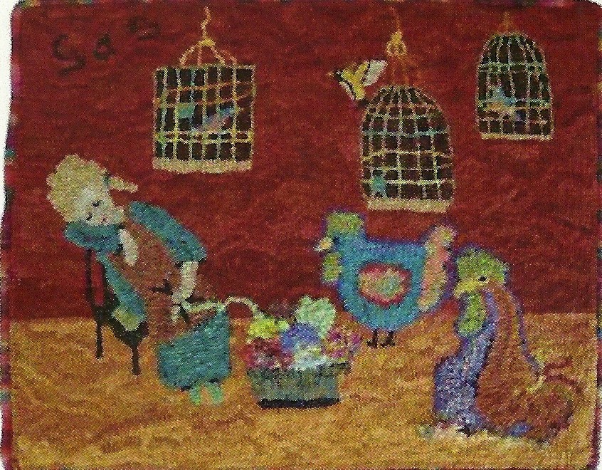 Napping Knitter, 24″ x 30″. Off the Hook Wool Rugs Pattern designed by Sharon A. Smith, now part of the W. Cushing Treasury of Patterns