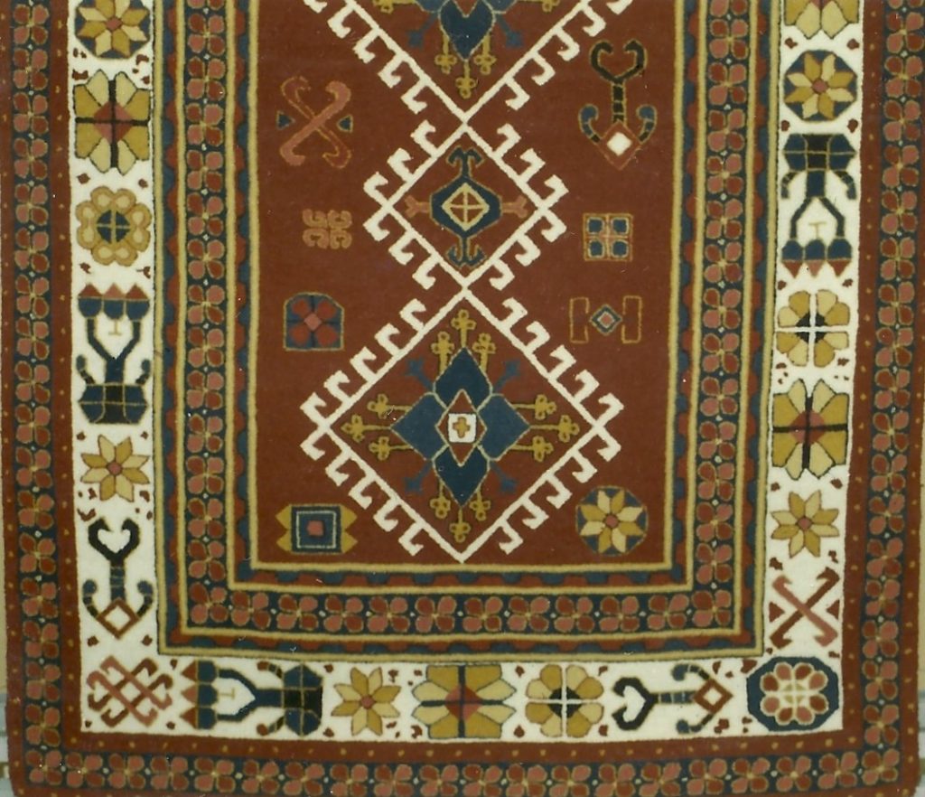 This beautiful oriental rug is Nomad Runner ( Medium) by Pearl McGown OSV 666C 43″ x 78″.  This pattern is available in other size–see listing. A good oriental pattern for bright colors and creativity.  Embellishments are fun to add, such as Arctic Rays or Metallic Yarn for a 3D effect.  Suggested wools to try are Green Oh Green, Imari Red, Marigold Magic, Gull and more from our hand dyed wools.  Mix Textured wool with Dyed wool for a complete look.  Please click the link to view all our in-stock textures.  https://dev.wcushing.com/product-category/textured-wool/