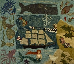 W. Cushing is proud to have Nola Hooks and Cactus Needle patterns!   Ocean Commotion, Pattern by Cactus Needle, 26 1/2” X 29 1/2”.   *Embellishments are fun to add, such as Arctic Rays or Metallic Yarn for a 3D effect.  Try our dip spots hand dyed wool for shading effects.  We have a large variety of hand dyed wools for your rug such as Jacob’s Indigo, Imari Jade, Deep Purple and more!  Mix Textured wool with Dyed wool for a complete look.  Please click the link to view all our in-stock textures.  https://dev.wcushing.com/product-category/textured-wool/