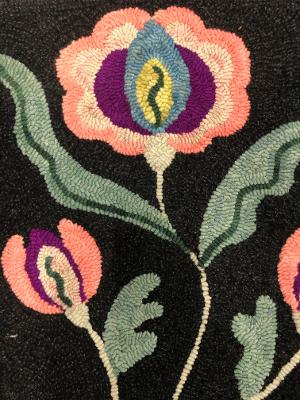 This cheerful rug was hooked by Fiber Artist, Karen Whidden.