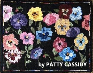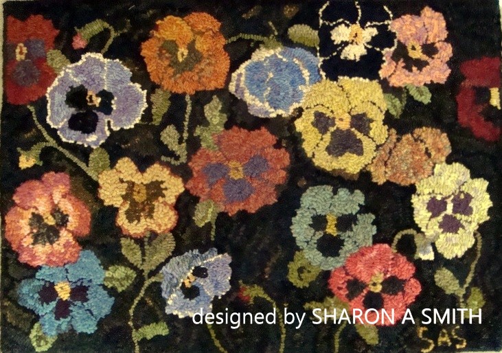 Pansies, 24″ x 30″  Off the Hook Wool Rugs Pattern designed by Sharon A. Smith, now part of the W. Cushing Treasury of Patterns. Companion piece to Poppies.