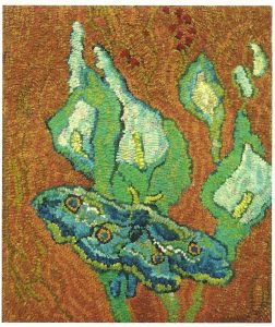 Peacock Butterfly after Van Gogh, 14″ x 18″ Off the Hook Wool Rugs Pattern designed by Sharon A. Smith, now part of the W. Cushing Treasury of Patterns. Makes a great pillow!