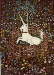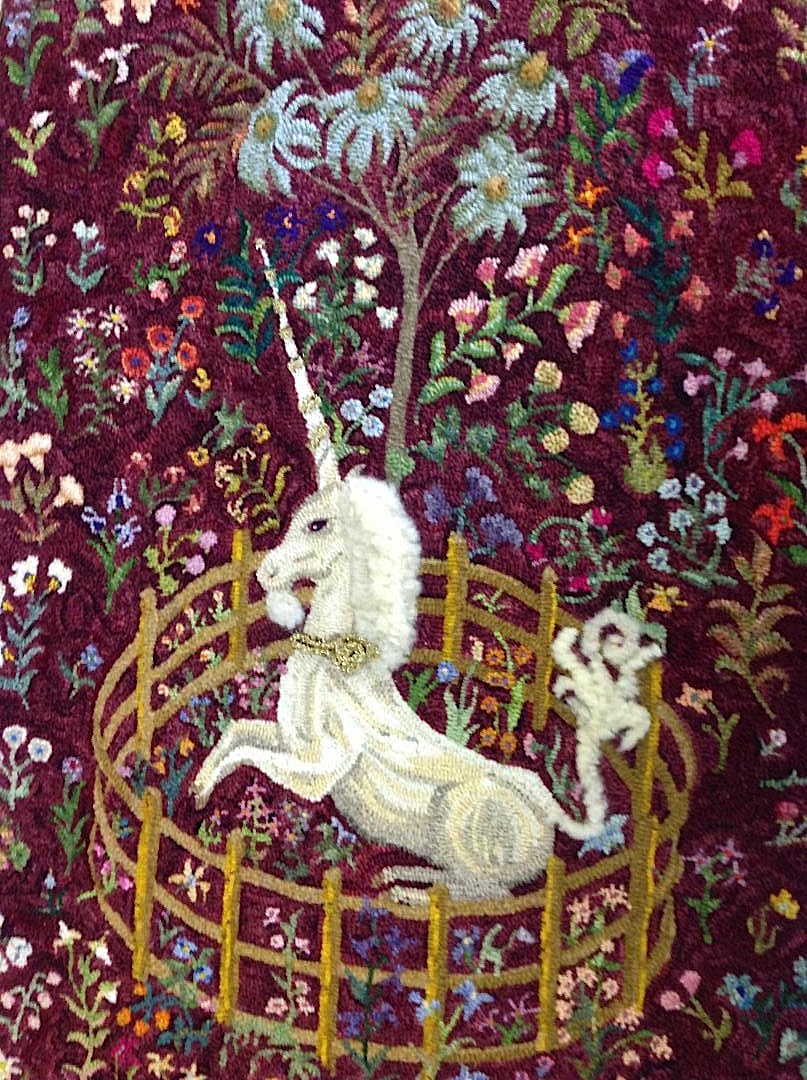 Unicorn in Captivity, Pearl McGown Pattern, 24 x 36. This pattern designed by Pearl McGown, based on the famous series of six tapestries created in the style of mille-fleurs (meaning: “thousand flowers”). The set, on display in the Musée De Cluny in Paris, is often considered one of the greatest works of art of the Middle Ages in Europe. Mates well with Unicorn and the Lady.