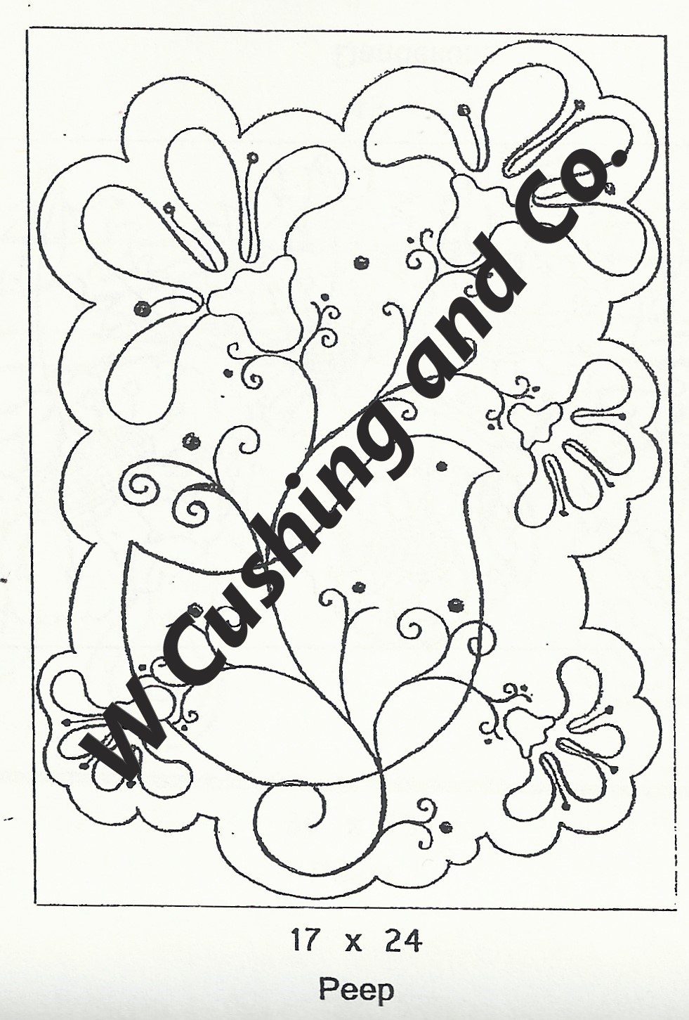 Peep, pattern by Primitive Grace, 17″ x 24″. A good way to incorporate all your favorite colors with your little chick. Fun to use velvet, metallics, burly spun yarns and your stash! Suggested wools are Purple Passion, Raspberry Burst, Stormy Seas, Imari Gold and Jade, Mother of Pearl and more from our dyed wools! Mix Textured wool with Dyed wool for a complete look. Please click the link to view all our in-stock textures. https://dev.wcushing.com/product-category/textured-wool/