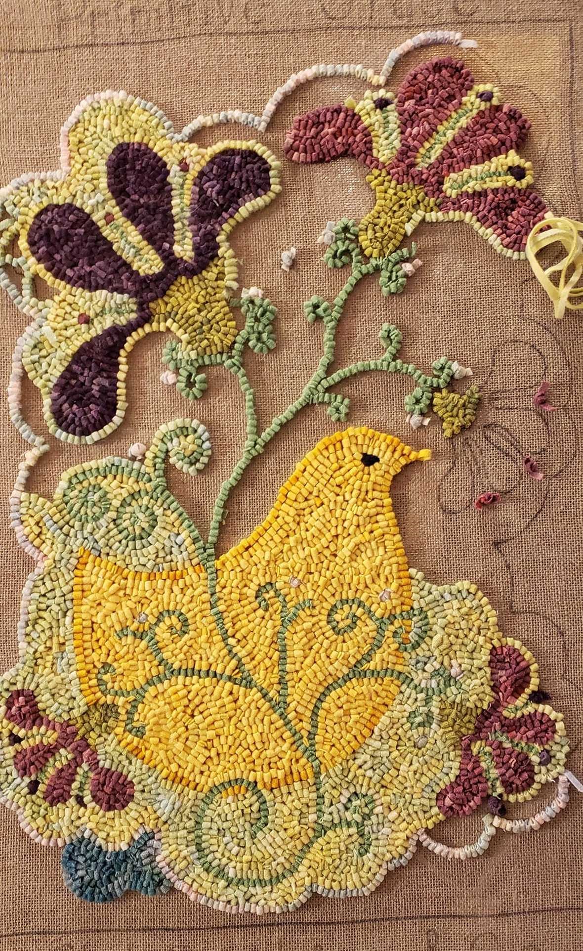 Peep (in progress and completed) hooked by Mary Allen. Other by Pam Landry. Very good job! Please email with any questions. We are happy to help color plan!
