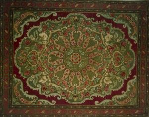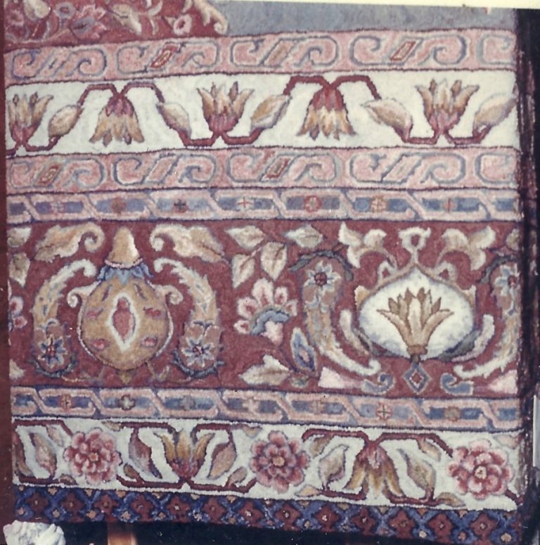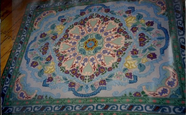 Our example was hooked by Carolyn Duncan….*it is of Persian Miniature pictured. This rug has the largest border of the set. Other examples from the archives of Joan Moshimer and had no names.