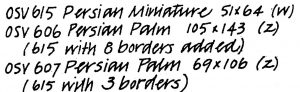 This wonderful oriental rug is Persian Palm Small by Pearl McGown OSV607 69″ x 106″ . This beautiful pattern is offered in alternate sizes with multiple border options….see other listings for Persian Palm Lg and Persian Miniature (OSV606, OSV615). Embellishments are fun to add, such as Arctic Rays or Metallic Yarn for a 3D effect. Suggested dyed wools are Bowl of Cranberries, Frosty, Fields of Green and more! Mix Textured wool with Dyed wool for a complete look.