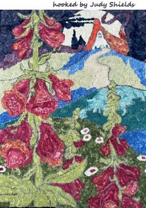 Moonlit Foxgloves, Storybook Cottage Series based on the artwork of Alida Akers, 18 x 24. Embellishments are fun to add, such as Arctic Rays or Metallic Yarn for a 3D effect. Some Dyed wools to use are Vinca Vine, Raspberry Burst, Gardens for Storybook Cottage, Best of Blue and more. Mix Textured wool with Dyed wool for a complete look. Please click the link to view all our in-stock textures. https://dev.wcushing.com/product-category/textured-wool/