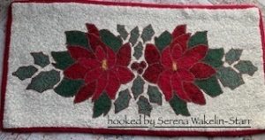 Poinsettia Runner, 18 x 38, wonderful for the Winter Season. P is for Primitive is thrilled to be the exclusive rug hooking designer and only offered from W Cushing and Co. Patterns are on linen with edges serged. We hope they complete your Christmas Tree look with these new patterns!
