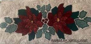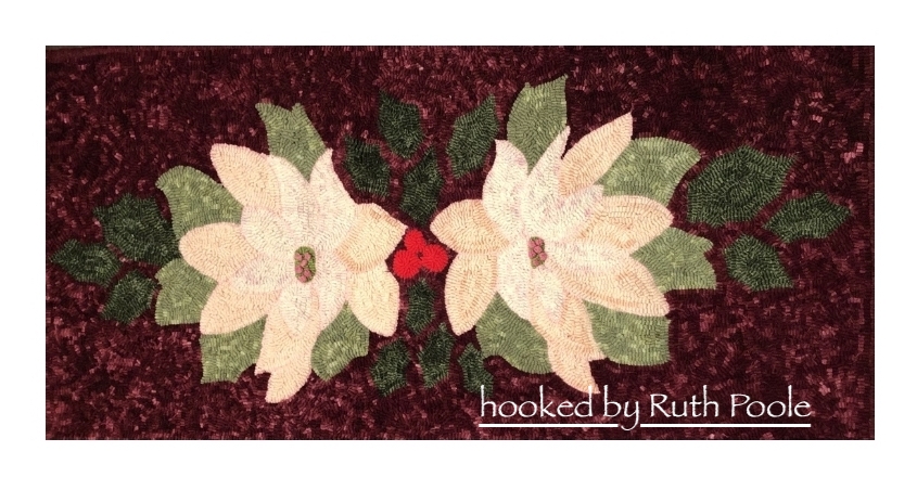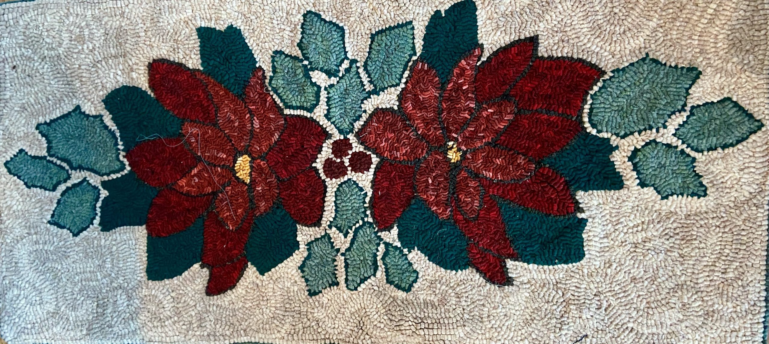 Poinsettia Runner, 18 x 38, wonderful for the Winter Season. P is for Primitive is thrilled to be the exclusive rug hooking designer and only offered from W Cushing and Co. Patterns are on linen with edges serged. We hope they complete your Christmas Tree look with these new patterns!