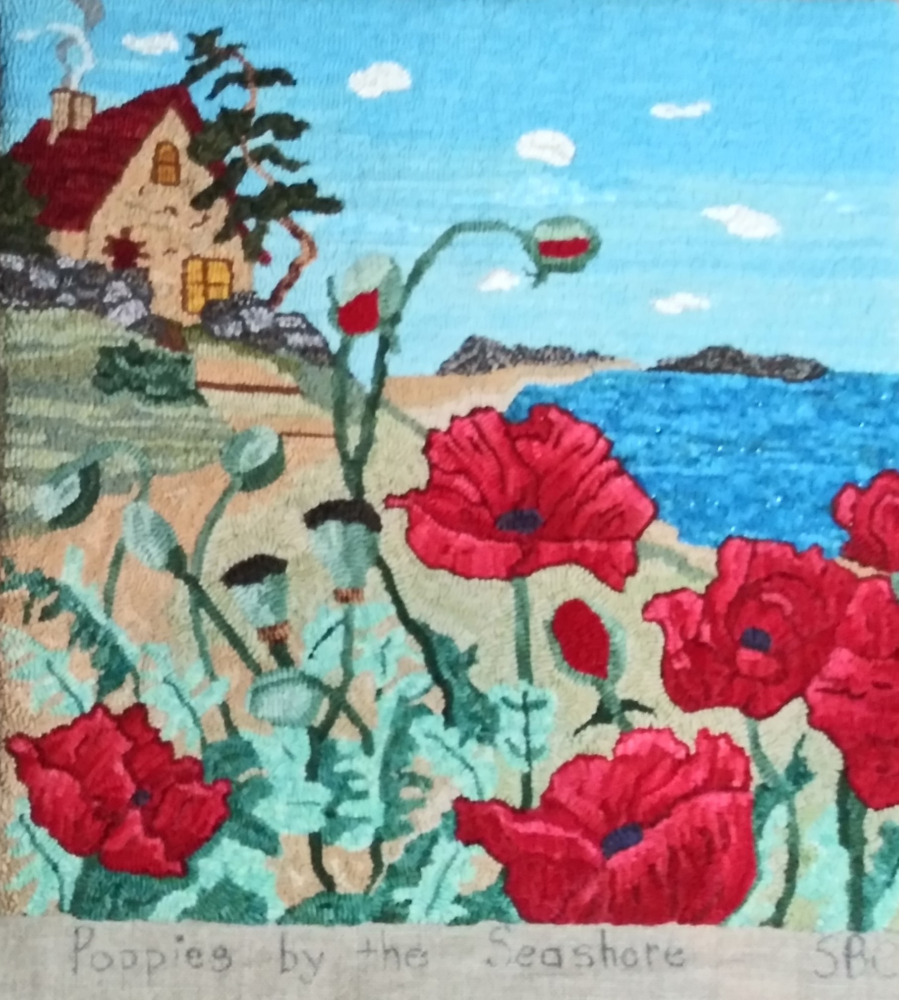 Poppies by the Sea, Storybook Cottage Series based on the artwork of Alida Akers, 24 x 24. Embellishments are fun to add, such as Arctic Rays or Metallic Yarn for a 3D effect.