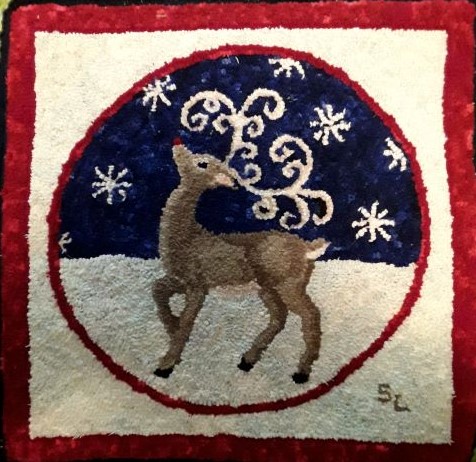 Prancer! Joan Moshimer’s Studio on our finest linen, just the pattern, 10″ round.  Great to hook and use in an easel, as a candle mat or the center of your wreath! Nicely done in any color!  A wonderful tile pattern to use embellishments such as Velvets, Arctic Rays, Fur, Roving, Burly Spun or Metallic Yarn for a 3D effect to add to your pattern!  Perfect way to be creative!  Try dyed wools such as Jacob’s Brown, Bowl of Cranberries, Snow and more!