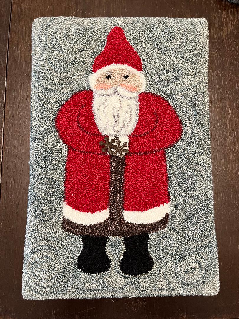 Snowflake Santa is 9 1/2″ x 5″ plus 3 metal snowflakes