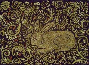Rabbit in the Cabbage Patch, 24″ x 30″. William Morris inspired, great in any color wave. Off the Hook Wool Rugs Pattern designed by Sharon A. Smith, now part of the W. Cushing Treasury of Patterns