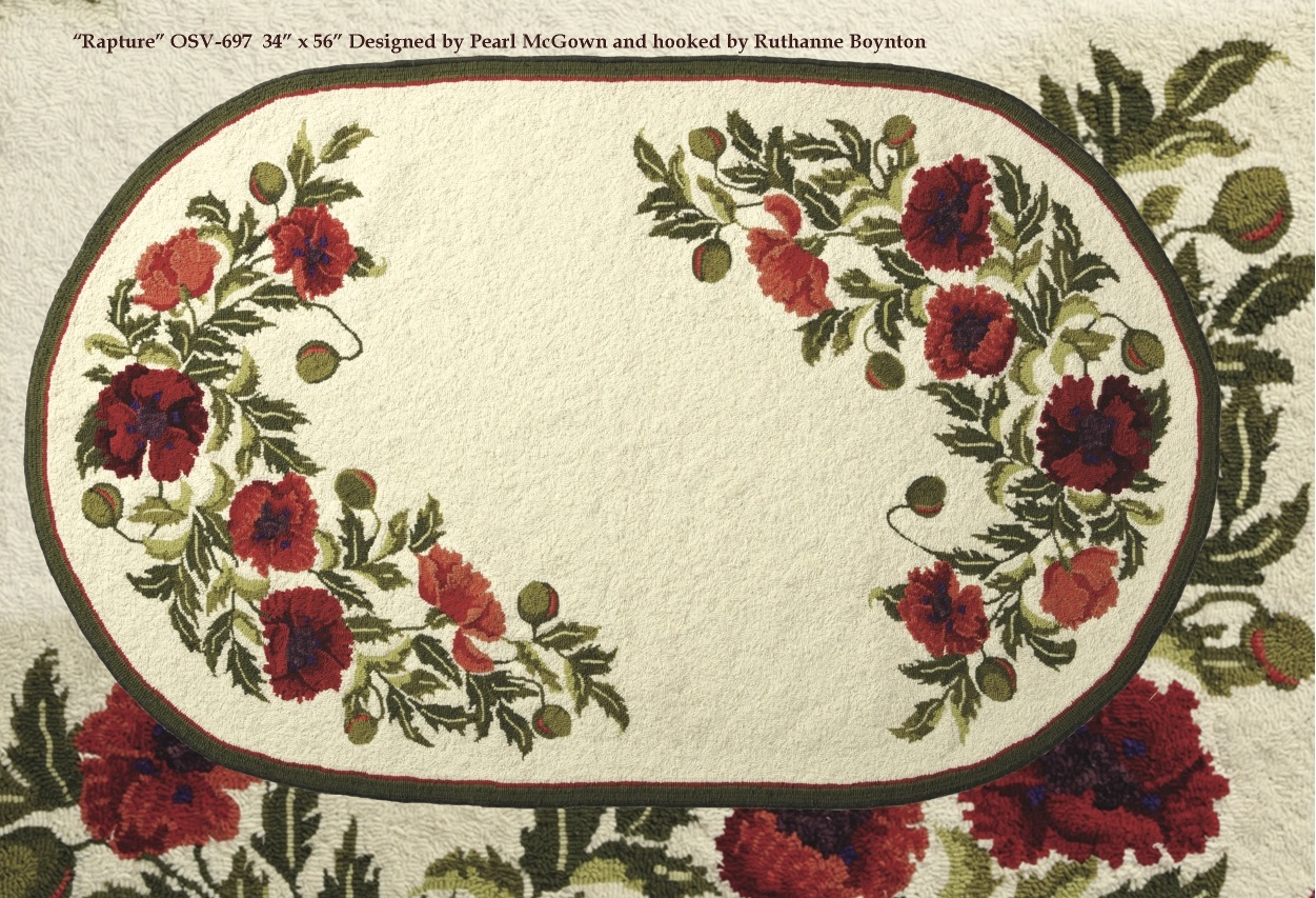 This wonderful rug, Rapture by Pearl McGown OSV 697 34″ x 56″. Such a beautiful rounded floral rug. Embellishments are fun to add, such as Arctic Rays or Metallic Yarn for a 3D effect. Some lovely dyed wools such as Better Than roses, Soft As Petals, Bowl of Cranberries, and Imari Jade are perfect for your Poppies! Mix Textured wool with Dyed wool for a complete look.