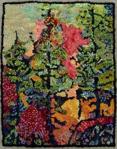 Redwoods, 15″ x 19″  Depicting these beautiful trees in an “abstract” way.  Off the Hook Wool Rugs Pattern designed by Sharon A. Smith, now part of the W. Cushing Treasury of Patterns.  Makes a great pillow!