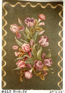 Rivalry by Pearl McGown OSV 665 29″ x 42″. It is a beautiful floral that embellishments are fun to add, such as Arctic Rays or Metallic Yarn for a 3D effect. Try our dip spots hand dyed wool for shading effects. We have a large variety of hand dyed wools for your rug such as Copley Square, Jacob’s Wild Grape, Jacob’s Teal Green, Raspberry Burst and more!