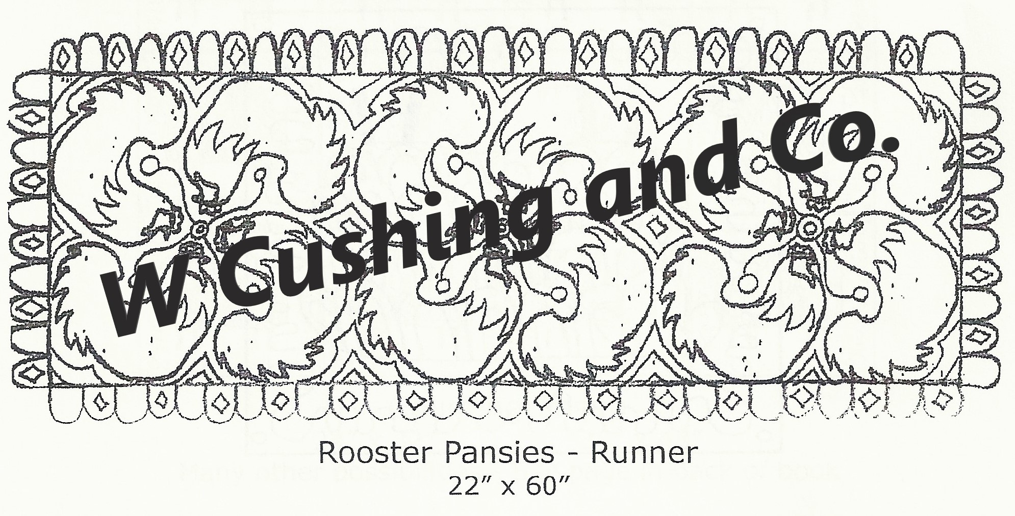 Rooster Pansies Runner, pattern by Primitive Grace, 22″ x 60″ A good pattern to get creative with. This pattern is available in 2 other sizes–see separate listings. Some dyed wools suggested are Caribbean, Amethyst, Yellow Topaz, Imari Jade, Garnet and more. Mix Textured wool with Dyed wool for a complete look. Please click the link to view all our in-stock textures. https://dev.wcushing.com/product-category/textured-wool/