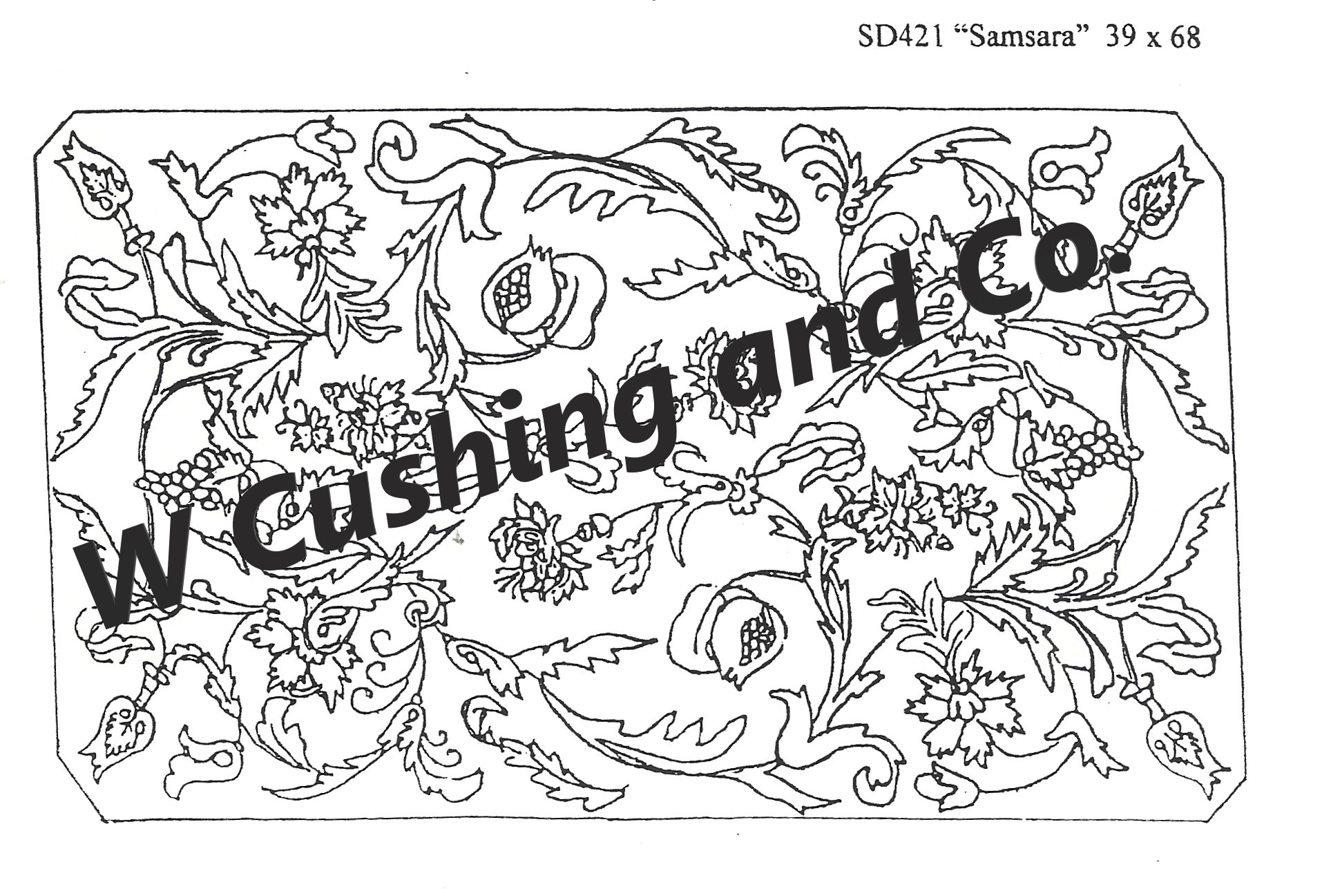 Samsara Pattern by Salma Dhanji 39 x 68 inches SD421. A wonderful oriental pattern. A great rug to use all your favorite colors. Embellishments are fun to add, such as Arctic Rays or Metallic Yarn for a 3D effect. Suggested dyed wools are Better Than Roses. Glacier, Imari Jade and more! Mix Textured wool with Dyed wool for a complete look. Please click the link to view all our in-stock textures. https://dev.wcushing.com/product-category/textured-wool/