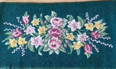 This wonderful floral by Joan Moshimer that can be customized to your favorite colors Early Spring 24 x 36  a great pattern! The colorful and beautiful hooked piece was done by Eugenia Culp.  Sizes are approximate.