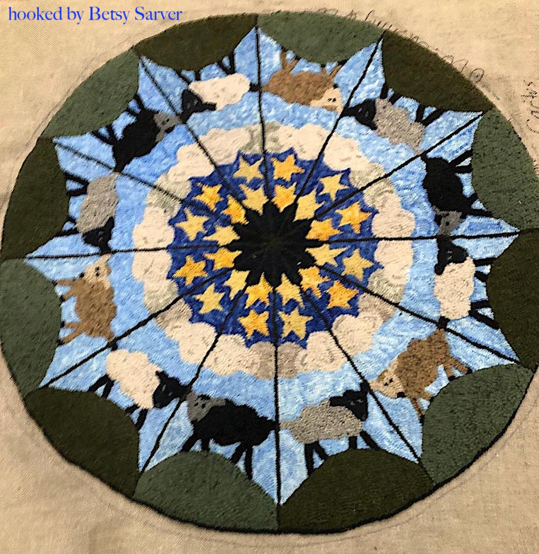 W. Cushing is proud to have Nola Hooks and Cactus Needle patterns!   Sheep Kaleidoscope, Pattern by Cactus Needle, 35 1/2″ round.    *Embellishments are fun to add, such as Arctic Rays or Burly Spun Yarn for a 3D effect.  Try our dip spots hand dyed wool for shading effects.  We have a large variety of hand dyed wools for your rug such as Snow, Sky, Jacob’s Peach, Misty and more! Mix Textured wool with Dyed wool for a complete look.  Please click the link to view all our in-stock textures.  https://dev.wcushing.com/product-category/textured-wool/
