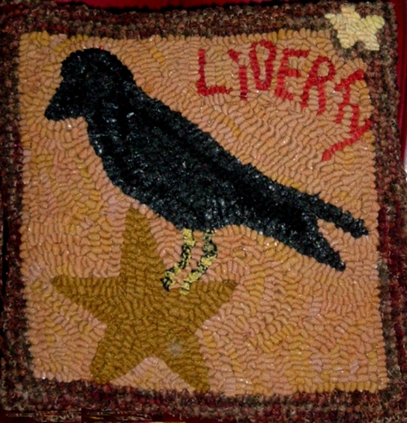 13″ x 13″ Starry Crow pattern by P is for Primitive. This pattern is on linen with edges serged. Makes a great pillow! Embellishments are fun to add, such as Arctic Rays or Metallic Yarn for a 3D effect.