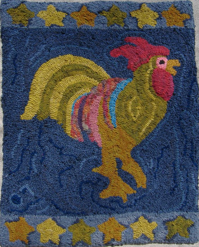 25″ x 20″ Starry Rooster pattern by P is for Primitive. This pattern is on linen with edges serged. Embellishments are fun to add, such as Arctic Rays or Metallic Yarn for a 3D effect.