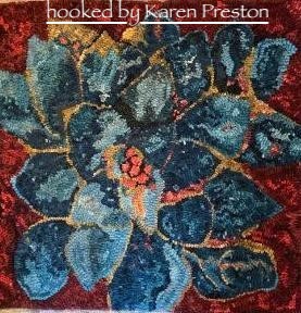 **Our hooked example with the reddish background was hooked by Karen Preston! So Pretty and vibrantly colored!