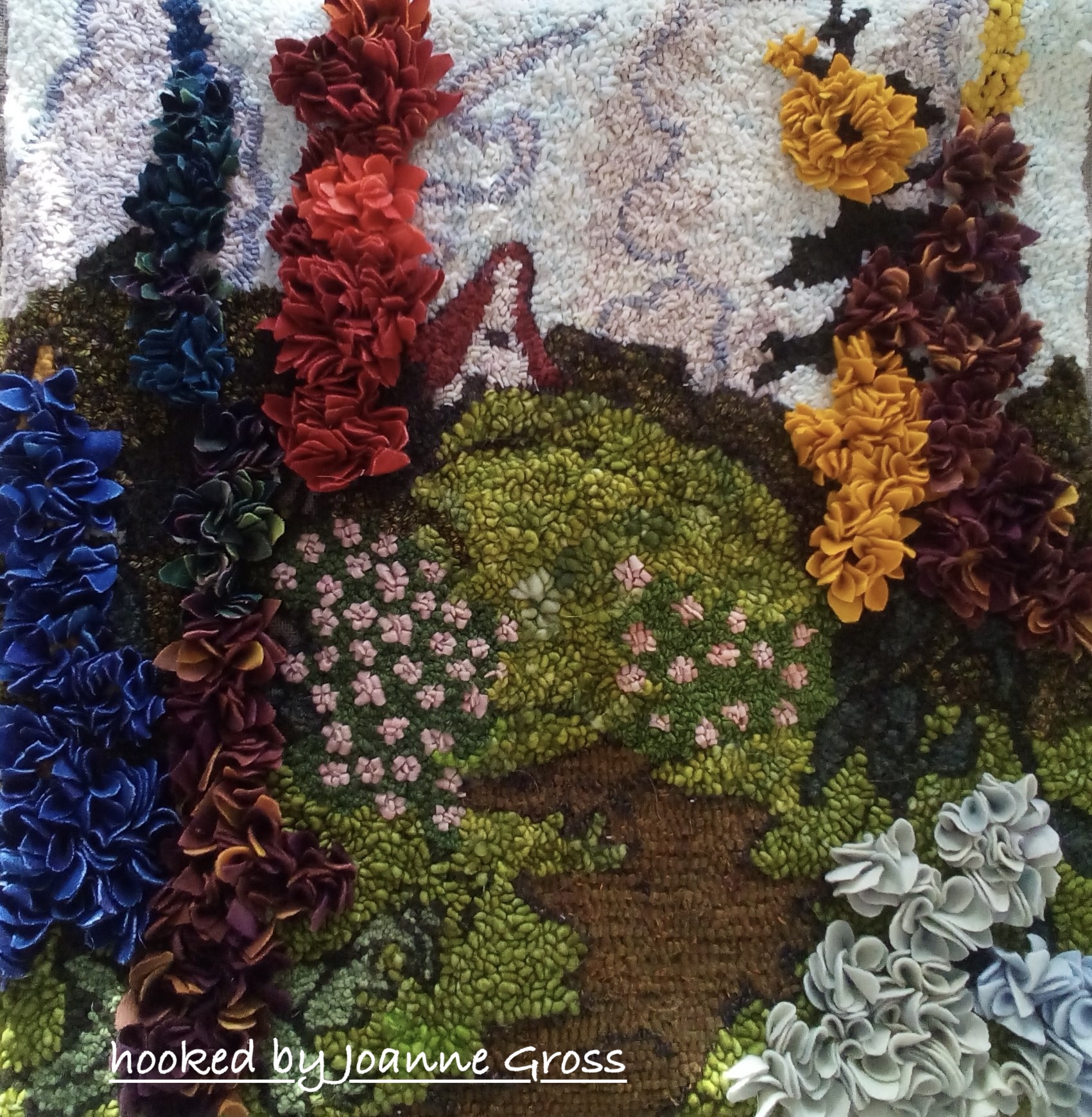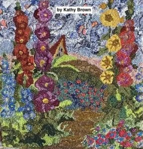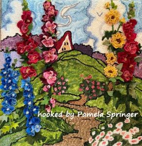 *Our example rug was hooked by Pamela Springer. Others by Joanne Gross, Patty Cassidy, and Kathy Brown.  Notice how they added embellishments to appear as though her flowers are real.   Just Gorgeous!