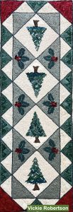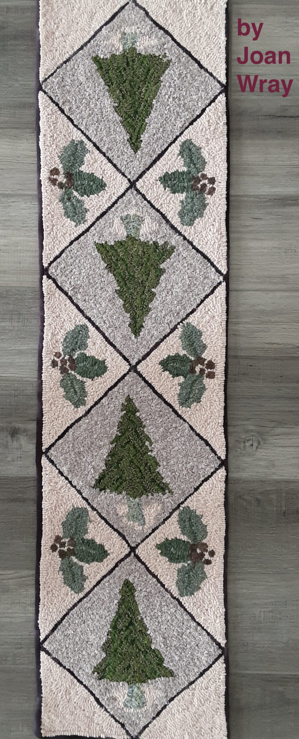 Joan Moshimer pattern, The Holly and Pine Tree Sampler–this one is TABLE RUNNER Size at 11/2″ x 45 1/2″.Great table runner to put out after the holidays until Spring!