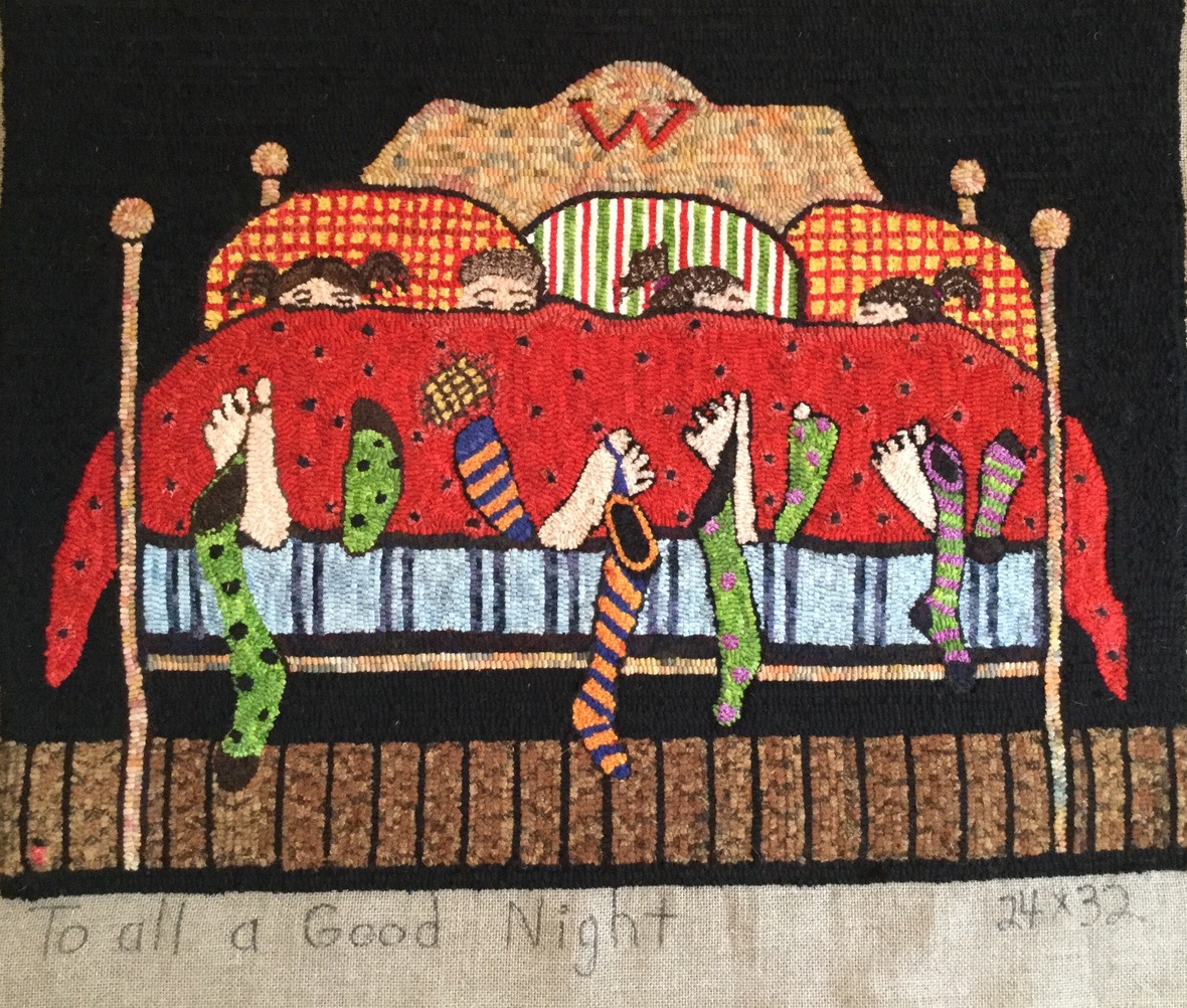 To All A Good NightBased on the artwork of Paige Koosed, this was hooked by Karen Whidden.  24 x 32 and great in any color combination!  Embellishments are fun to add, such as Arctic Rays or Metallic Yarn for a 3D effect.  Such an adorable stockings pattern…great for holiday hooking!