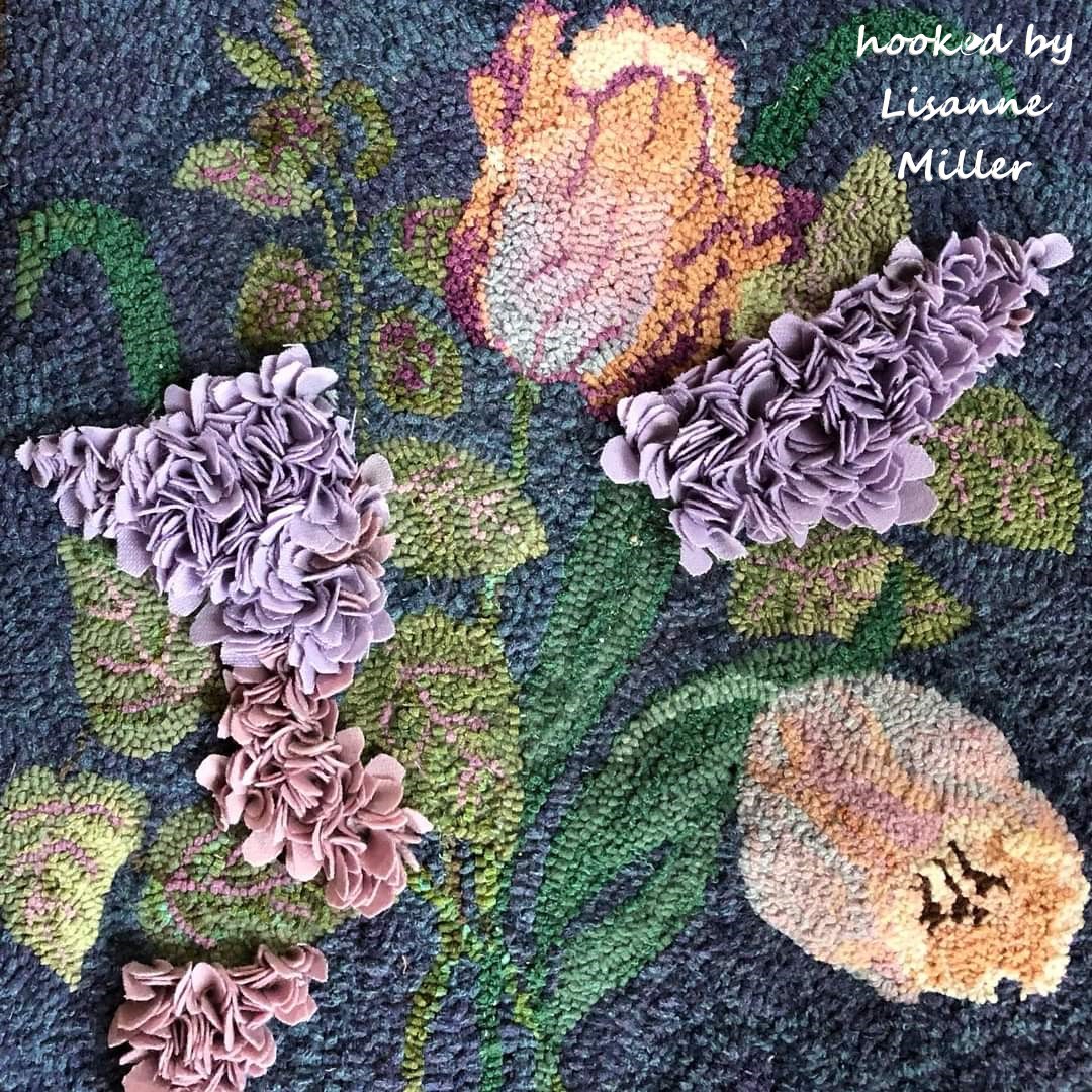 Tulips and Lilacs,  a classic originally designed by Anita Allen and brought to you by Joan Moshimer Studio.   Makes beautiful pillows!  A perfect pattern for any color plan and practice your proddy!  Size is 17 x 19. Embellishments are fun to add, such as Arctic Rays or Metallic Yarn for a 3D effect. Try fur, velvets or boucle yarn as mixed media in your rug.  Some suggested dyed wools to try are Cupids Blush, Raspberry Burst, Imari Violet, Grassy Knoll and more!  Mix Textured wool with Dyed wool for a complete look.  Please click the link to view all our in-stock textures.  https://dev.wcushing.com/product-category/textured-wool/