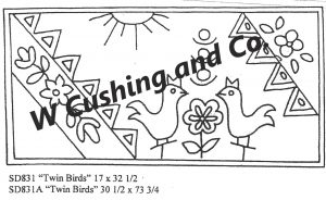 Twin Birds Pattern by Salma Dhanji SD831 17 x 32.5 inches A wonderful  pattern.  This pattern is available in another size–see separate listing.  *Embellishments such as Artic Rays, Fur, Roving, Burly Spun or Metallic Yarn for a 3D effect to add to your pattern!  Perfect way to be creative!  Some beautiful dyed colors to use are Amethyst, Hunters Moon, Yellow Topaz, Best of Blue, Sepia and more from our dyed wool.  Mix Textured wool with Dyed wool for a complete look.  Please click the link to view all our in-stock textures.  https://dev.wcushing.com/product-category/textured-wool/