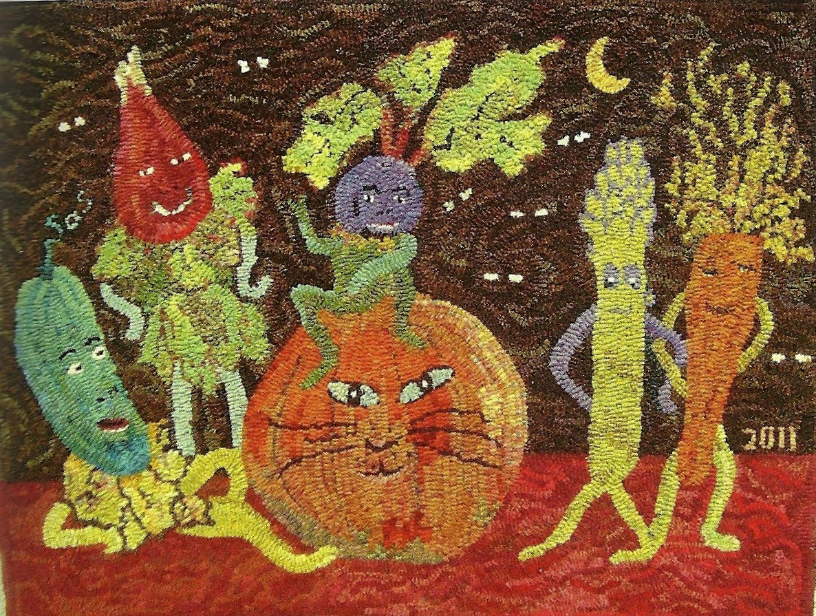 Veggies Matter, 24″ x 35″. Off the Hook Wool Rugs Pattern designed by Sharon A. Smith, now part of the W. Cushing Treasury of Patterns