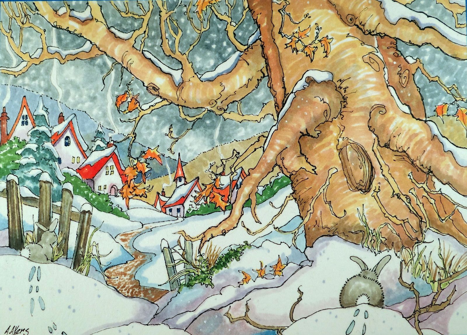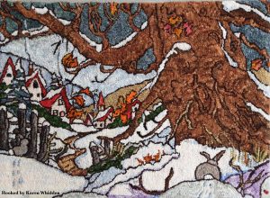 Village Snowfall, 17 x 24, based on the artwork of Alida Akers…Part of the Storybook Cottage Series. Embellishments are fun to add, such as Arctic Rays or Metallic Yarn for a 3D effect.