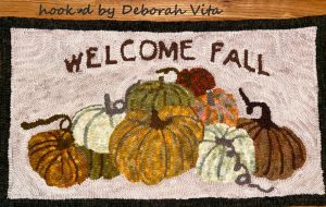 Welcome Fall, 15 x 27. Perfect size for your table, a trunk or to hang on the wall! Very versatile and a great fall rug! Embellishments are fun to add, such as Arctic Rays or Metallic Yarn for a 3D effect.