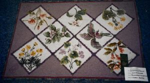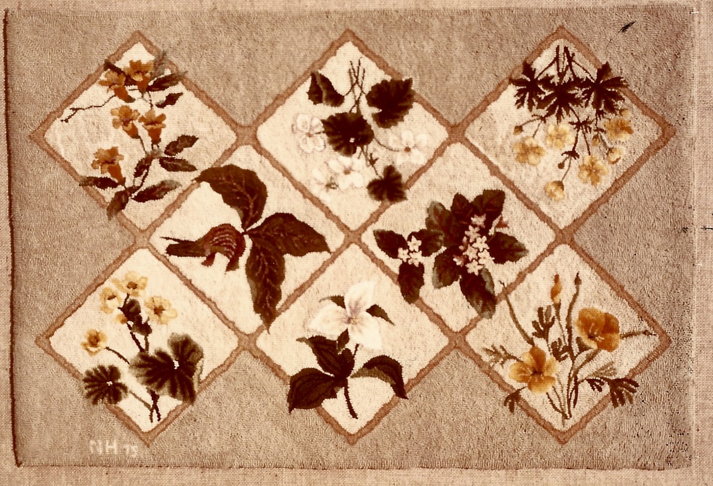 Please note–our example is from the archives of Joan Moshimer Studios, there are no names available for the light colored rug. The darker was hooked by Carol Barker.