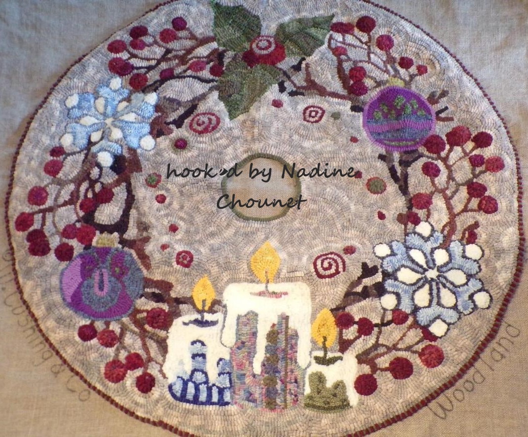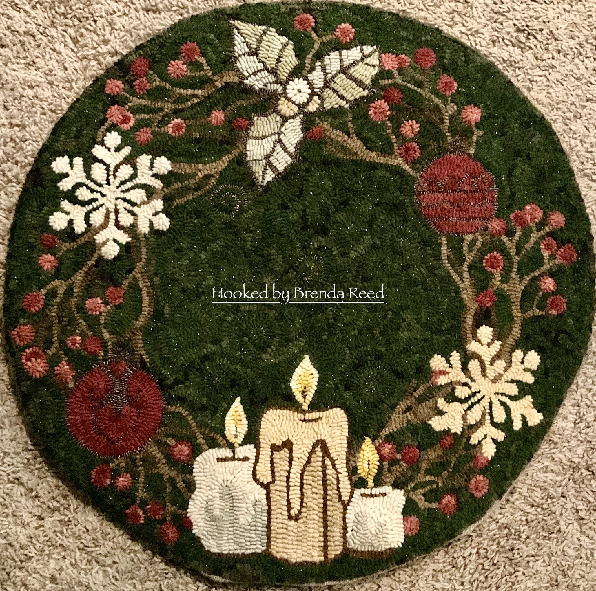Woodland Wreath Table Topper, one from our newest Holiday Tree Skirt and Table Top Series. P is for Primitive is thrilled to be the exclusive rug hooking designer and only offered from W Cushing and Co. Patterns are on linen with edges serged.  Also makes a great wall hanging.  Sizes are approximate.